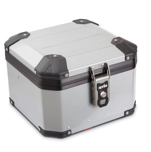 Topkoffer in aluminium capaciteit 41 LT, ultrabestendig en ruim. Het is gepoedercoat om maximale bescherming en duurzaamheid te bieden – geschikt voor één Aprilia multi-road helm en nog veel meer. Uitgerust met een hermetische sluiting die waterlekkage of stofinfiltratie voorkomt en scharnieren van ABS, is deze aluminium topkoffer ontworpen om intensief gebruik en ongunstige omgevingsomstandigheden te weerstaan. Sleutelslot op maat met Aprilia-logo. Een kwaliteitsproduct 100 % Made in Italy. Vereist installatie van een specifiek achterrek (2S001858) zonder dat een specifieke montageplaat nodig is. Eenvoudig te verwijderen systeem met slechts één sleutel voor openen en demonteren.
