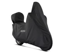 Beschermhoes met openingen voor accessoires. Kleur zwart met reflector strip, transparante kentekenplaat venster . Piaggio logo.